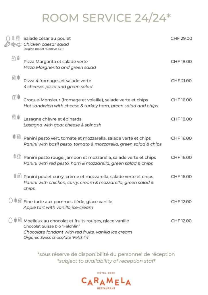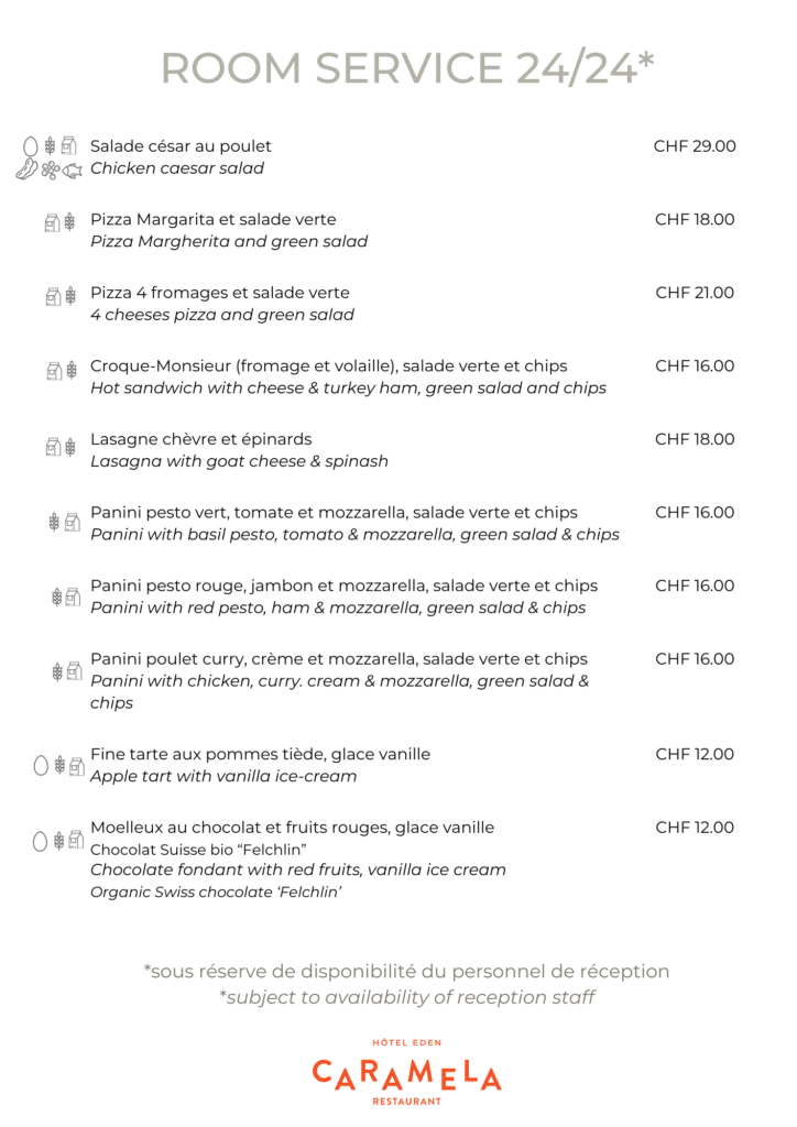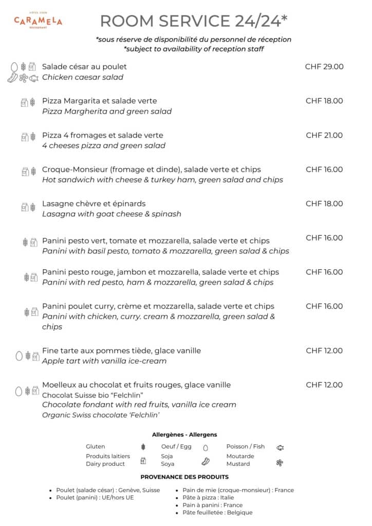 Cette carte de room-service est disponible 24h/24 et 7j/7.